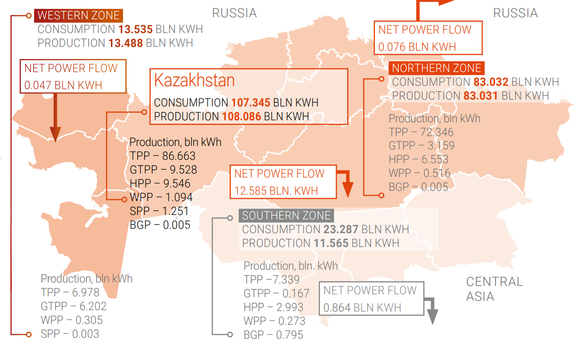 The western zone – A significant share of electricity consumption is made by oil and gas companies with their own generating sources. There are no electrical connections of the West with the North and South of Kazakhstan through the territory of the country.