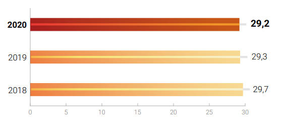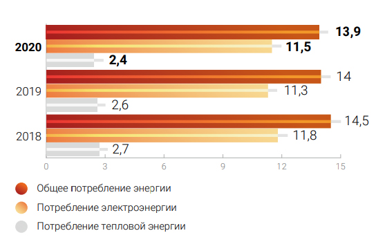 The volumes of consumption of fuel and energy resources within the organization, as well as volumes of electricity and heat produced, electricity transmitted and coal mined were used in this indicator. According to the 2020 results, the energy intensity of the gross commodity product across “Samruk-Energy” JSC group of companies amounted to 29.2 t.s.f / mln tenge and decreased compared to the previous year figure.