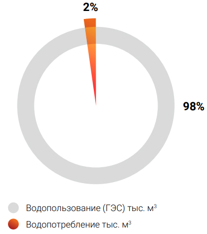 Considering that “Samruk-Energy” JSC’s portfolio includes hydropower and thermal power plants, we classify interaction with water into water use and water consumption, respectively. At the same time, 98 % of the volume of water withdrawn is classified as water use at HPPs, and 2 % – as water consumption. “Samruk-Energy” JSC group of companies does not consume water in regions that experience water shortage.