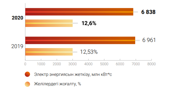 Электр энергиясын жеткізу көлемі – 6 838 млн кВт*с құрады, 2019 жылғы деңгейге қарағанда азайды (124 млн кВт*сқа төмендеді). COVID-19 пандемиясына сай орын алған елдегі төтенше жағдайға байланысты Алматы өңірінде тұтынудың азаюы салдарынан «Алатау Жарық Компаниясы» АҚ-ға электр энергиясын жеткізу көлемі төмендеді