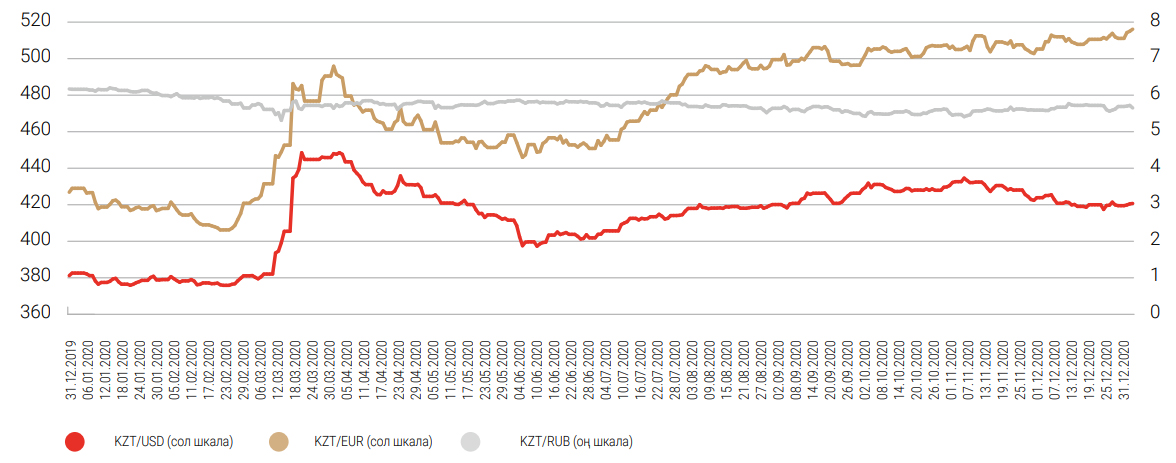 Жыл бойы реттеуші органдар сыртқы экономикалық конъектураның нашарлауына байланысты валюта нарығында белсенді саясат жүргізді, бұл ұлттық валюта бағамының одан әрі құлдырауын тоқтатуға мүмкіндік берді. Бір жыл ішінде ұлттық валюта 10,4 %-ға дейін әлсіреп, бір доллар бағасы 420,71 теңге болды, 2020 жылғы 4-тоқсанда 2,0 %-ға нығайды. 4-тоқсанда ұлттық валюта бағамын тұрақтандырудың негізгі факторы мұнай бағасының барреліне 26,5 %-ға, 51,8 долларға дейін өсуі болды.