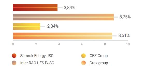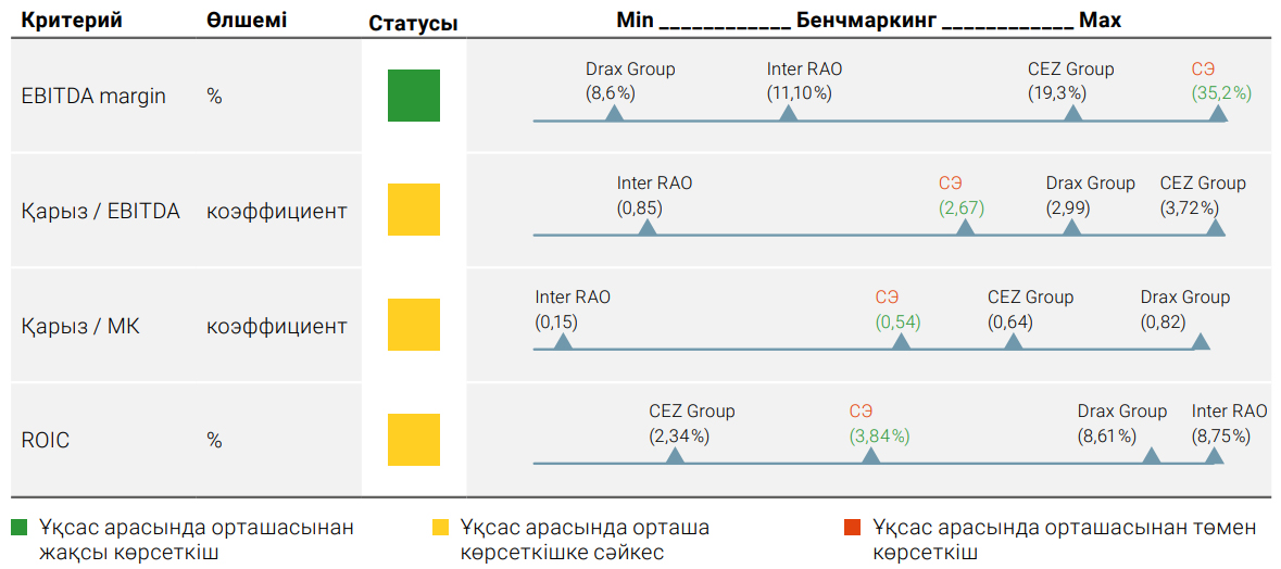 Сонымен қатар, EBITDA margin көрсеткіші бойынша, «Самұрық-Энерго» АҚ өзінің ұқсас компанияларынан басым түседі. Бұл көрсеткіш сатудан түсетін кірістің жоғары екенін көрсетеді. ROIC көрсеткіші (салынған ұзақ мерзімді капиталдың рентабельділігі) бойынша «Самұрық-Энерго» өзге еуропалық ұқсас компаниялардың деңгейінде. Десек те, осы көрсеткіш бойынша «Самұрық-Энерго» қызметінің экономикалық талаптары ұқсас келетін ресейдің холдингінен едәуір төмен деңгейде, бұл инвестициялардың тиімділігін (рентабельділігін, қайтарымдылығын) арттыру қажеттігін көрсетеді.