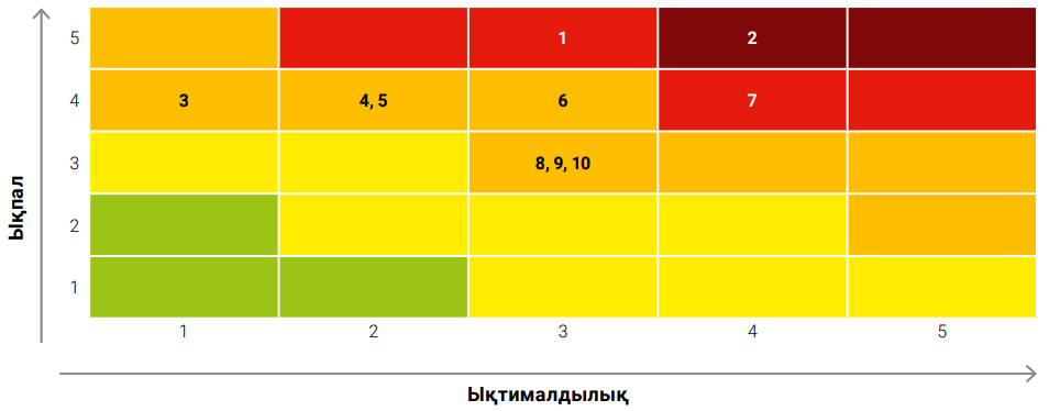 Осы қайта бағалау нәтижелері бойынша 2020 жылға арналған Тәуекелдер картасының негізгі аймағына 10 тәуекел кірді (2019 жылы – 13 негізгі тәуекел):
