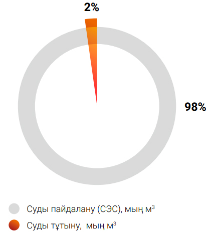 «Самұрық-Энерго» АҚ портфелінде су электр станциялары мен жылу электр станцияларының бар екенін ескере отырып, сумен өзара іс-қимылды тиісінше суды пайдалану және суды тұтыну деп жіктейміз. Бұл ретте алынатын су көлемінің 98 % СЭС-терде суды пайдалану санатына, ал 2 % суды тұтынуға жатады. «Самұрық-Энерго» АҚ Компаниялар тобы су ресурстары тапшы өңірлерде суды тұтыну қызметін жүзеге асырмайды.